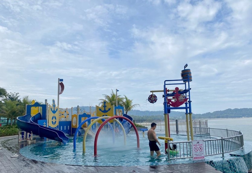 A scenic pool area overlooking the sea, ideal for relaxing dips and family fun.